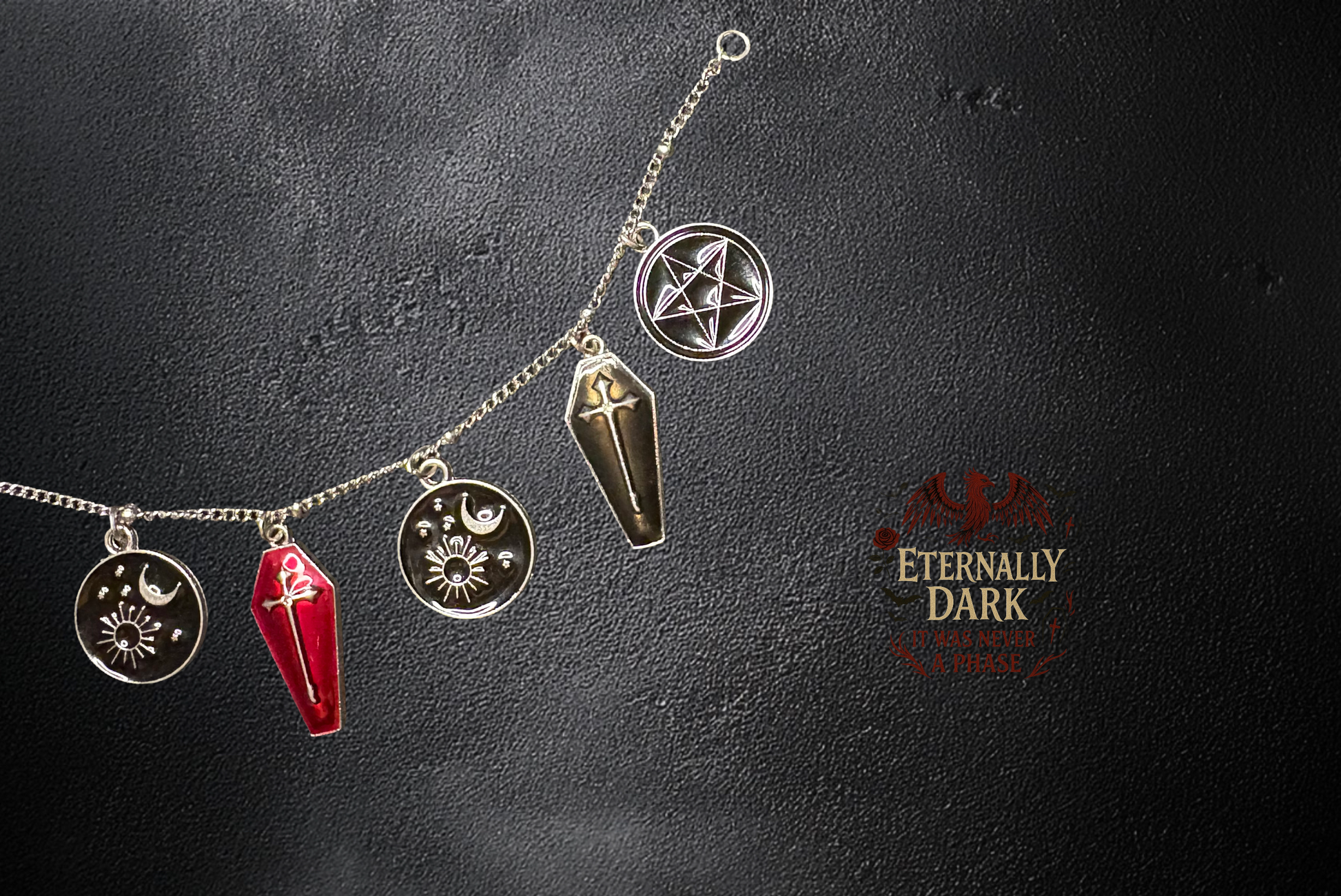With a blood-red coffin at its center and silver charms of moons, suns, and a protective pentagram, this bracelet is a relic of both beauty and darkness. It embodies eternal rest, eternal power, and eternal style — a striking piece for the gothic soul.